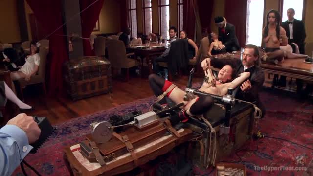 Redheaded sybian slut Violet Monroe does drooling deepthroat on BBC bound in brutal strappado!
